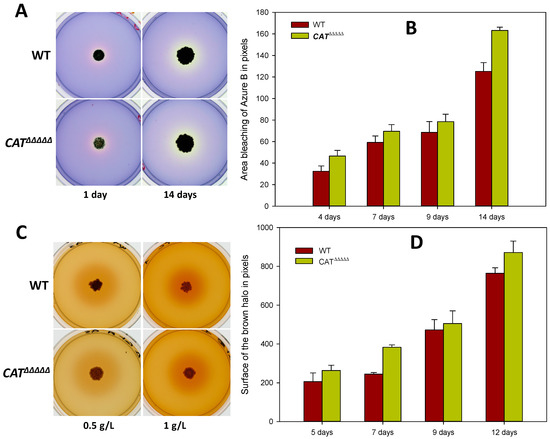 Discoloration of Azure B and transformation of lignin as a function of the incubation time. (A,C) Actual plates; quantification for Azure B bleaching (B) and lignin transformation (D) by P. anserina wild-type (WT) (brown bar) and CATΔΔΔΔΔ (green bar).