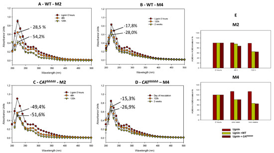 UV-visible absorption spectra of lignin (20 µM) in M2 medium in the presence of P. anserina wild-type (WT) (A) and CATΔΔΔΔΔ (C) at 0 h (brown circles) 48 h (orange circles) green triangle pointing down (120 h). UV-visible absorption spectra of lignin (20 µM) in M4 medium in presence of P. anserina wild-type (WT) (B) and CATΔΔΔΔΔ (D) at 0 h (brown circles) 120 h (orange circles) green triangle pointing down (2 weeks). (E) Absorbance at 280 nm at time “t” divided by absorbance at 280 nm at t zero hours (A280-t/A280-t0).