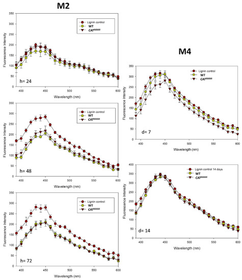 We also analyzed the fluorescence spectrum with UV excitation at 355 nm of lignin before and after adding the fungus (Figure 6). The shape of the emission spectra of lignin alone was quite simple, with a peak around 430 nm, as observed elsewhere [48]. At the time of inoculation, no real differences between the lignin spectra were observed with or without the fungus. However, in M2 medium after 48 and 72 h of incubation, the intensity of the fluorescence of a large peak comprised between 410 and 460 nm decreased by around 23–25% in the sample treated with the fungus when compared to the control without P. anserina, arguing again that the fungus modified the chemical structure of lignin. The same result was observed in the M4 medium with a delay of a few days. According to Barsberg et al. [48], the decrease is due to the interaction between free quinones, either produced by the fungus or released by lignin degradation, and lignin. We can thus tentatively propose that the modification of the UV spectrum showing a hypsochromic shift in the peak from 280 to 270 nm corresponded to the loss of benzene rings coupled with the decrease in fluorescence of the lignin interacting with quinones.