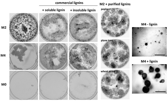 The dung pellets described in Figure 1 were incubated in humid chambers made with glass Petri plates. For the solid cultures of Figures S2 and S4, plates with Ø = 9 cm containing 27 mL of M2, M4 or 15 mL of cultures supplemented with the various solid biomasses were used. Note that in the plates with solid biomasses, the amount of jellified medium was lowered to avoid the complete submersion of the solid materials. For liquid cultures, plates with Ø = 5 cm contained 10 mL for growth and fertility assays (Figure 2, Figure 3, Figure 7, Figure 8, Figure 10 and Figure S4) and 5 mL for spectroscopy analyses (Figure 4, Figure 5 and Figure 6). Addition of sterile lignins and phenolics at concentrations ranging from 0.001 g/L to 1 g/L was carried out just before adding the fungus.