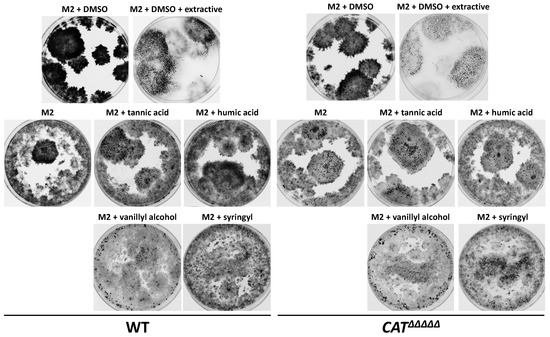 Interestingly, CATΔΔΔΔΔ was able to grow better than the wild-type and to produce perithecia in liquid M2 (Figure 8). Moreover, all compounds identified as restoring growth and fertility of the wild-type did so for the CATΔΔΔΔΔ mutant, but with a stronger effect at the same concentrations (Figure 8). Overall, this argued for a role of oxidative stress generated by the presence of lignin and other polyphenols in restoring the growth and fertility of P. anserina in liquid cultures.
