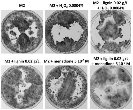 To directly test if oxidative stress promoted the growth and fertility of liquid culture, hydrogen peroxide (H2O2) and menadione, a quinone generating superoxide by auto-oxidation in a redox-cycling reaction within the cells, were added to cultures of wild-type P. anserina in the presence or in the absence of lignin. In the absence of lignin, no improvement in growth and fertility was observed at low concentrations (0.0004% for H2O2 and 5 × 10−6 M for menadione), while at higher concentrations, both chemicals were toxic and inhibited growth (Figure 10). Interestingly, in the presence of 0.02 g/L of soluble lignin, which did not promote fertility but only a slight growth improvement, 0.0004% H2O2 and 5 × 10−6 M menadione triggered the development of fruiting bodies. Hence, oxidative stress is able to promote growth and fertility in the presence of lignin, confirming the notion that improved growth and fertility is connected to the production of reactive oxygen species.