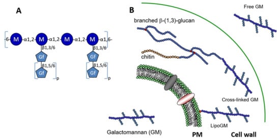 The structural cell wall polysaccharides (chitin and β-1,3-glucan) are synthesized at the plasma membrane level by protein complexes [29]. In contrast, the GM is intracellularly synthesized, where Golgi transporters of GDP-Man and UDP-Galf are required for the GM polymerisation.