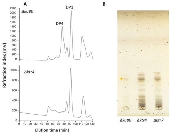 The structures of lipid anchored galactomannans are totally altered in Δktr mutants. (A) Analysis by acetolysis of the Lipo-galactomannan like produced by Δktr4 mutant. Lipo-GM fraction was purified from total membrane of mycelium and purified as previously described [18,34]. Mannan structure was analysed by acetolysis degradation and gel filtration chromatography on TSK-40S column. The degradation of Lipo-GM from the parental strain (Δku80) leads to the release to two main products: DP1, corresponding to the galactofuranose that is sensitive to acetolysis and a DP4 corresponding to the tetramannoside repeat unit. Acetolysis cleaves preferentially α-1,6-mannosyl linkage. The degradation of the Lipo-GM produced by the Δktr4 mutant did not release specifically a tetramannoside showing the absence of α-1,2-mannose linked residues. (DP: degree of polymerization). (B) TLC analysis of Glycosyl-Inositolphosphoceramide (GIPC) fraction produced by Δktr mutants. GIPC fractions was purified from from total membrane of mycelium and analysed by TLC (Thin layer chromatography), as previously described [36]. In comparaison to parental Δku80 strain, both GM deficient mutants (Δktr4 and Δktr7) produce larger GIPCs in higher amount.