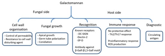 The GM that is produced by A. fumigatus is a unique fungal polysaccharide. Although it has been described 50 years ago, recent discoveries on its biosynthesis highlight its importance for the vegetative growth and for the fungal cell wall organisation. The overall functions of this polysaccharide are summarized in Figure 4. Based on this prevalence of aspergillosis infections, future investigations will be operated under three axes:
