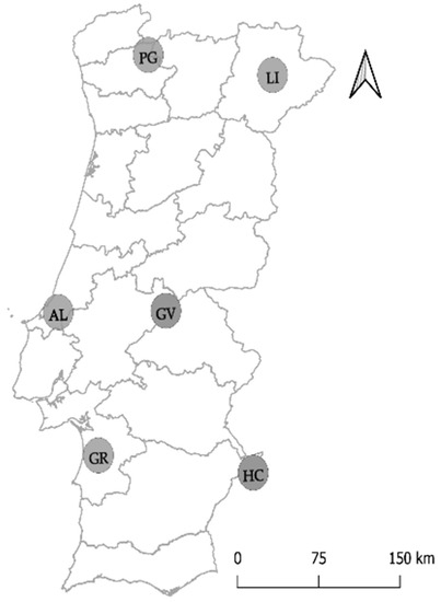 Distribution of cork oak stands sampled in Portugal. Letters represent sampled location (PG: Peneda-Gerês; LI: Limãos; GV: Gavião; AL: Alcobaça; GR: Grândola; HC: Herdade Contenda).