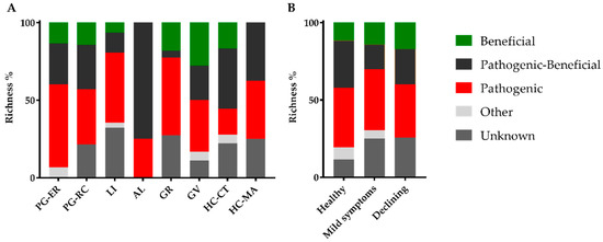 Cork oak endophytic fungal functional groups presented in cork oak forests (A) and disease severity level (B). Operational taxonomic units (OTUs) belonging to more than one functional group were added to both, except for the pathogenic–beneficial group that is represented as such.
