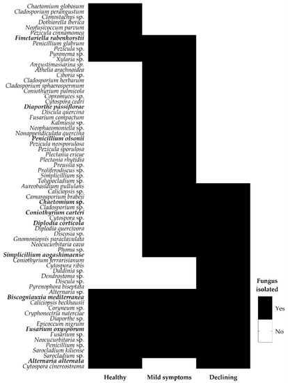 Endophytic fungal OTUs recovered from cork oak trees at different disease severity levels. Black/white color indicates fungal isolation/no isolation from trees with different disease severity levels. Isolates used in this work are depicted in bold.