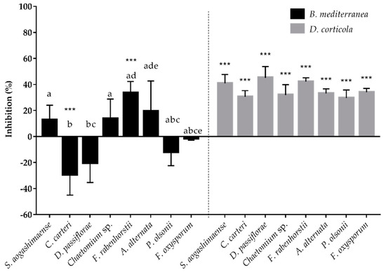 Inhibition of B. mediterranea and D. corticola growth caused by the tested endophytic fungi in dual-culture assay. Negative values indicate that the area of the plate covered by the interacting pathogen was higher than that of the control. Different letters represent statistical significance (p ≤ 0.005) between endophytes in each antagonistic assay and *** (p ≤ 0.001) represents statistical significance between the control and co-culture of a pathogen.