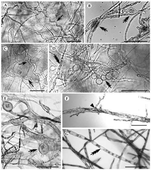 Hyphal modifications produced in the interaction between S. aogashimaense and B. mediterranea (A,B), S. aogashimaense and D. corticola (C,D) and A. alternata and B. mediterranea (E–G). Single arrows designate coiled hyphae, double arrows vesicle-like structures and triple arrows hyphal vacuolization. Black line represents 50 µM scale.