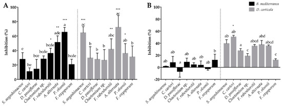 Inhibition of B. mediterranea and D. corticola growth caused by non-volatile (A) and volatile compounds (B) produced by the tested endophytic fungi. Negative values indicate that the area of the plate covered by the interacting pathogen was higher than that of the control. Different letters represent statistical significance (p < 0.005) between endophytes in each antagonistic assay and * (p ≤ 0.05), ** (p ≤ 0.01) and *** (p ≤ 0.001) represent statistical significance between the control and co-culture of a pathogen.