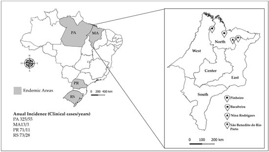 Study area of Maranhão state. The annual incidence of chromoblastomycosis in Maranhão state and endemic areas is shown in gray on the map [6]. The area of study was located in the North and East of Maranhão state. Bacabeira, latitude: 02° 58′ 15″ S; longitude: 44° 18′ 56″ W; altitude: 44 m; area: 650 km2. São Benedito do Rio Preto, latitude: 3° 19′ 59″ S; longitude: 43° 31′ 40″ W; altitude: 22 m; area: 931.48 km2. Pinheiro, latitude: 02° 31′ 17″ S; longitude: 45° 04′ 57″ W; altitude: 15 m; area: 1559 km2. Nina Rodrigues, latitude: 3° 27′ 53″ S; longitude: 43° 54′ 19″ W; altitude: 33 m; area: 572.5 km2.