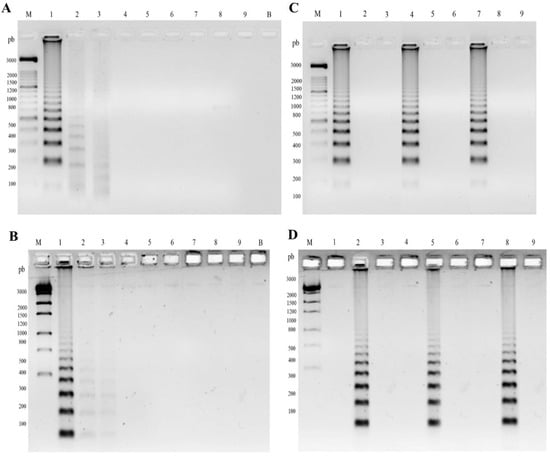 One microliter of ligation product was used as a template for RCA. The total volume was 12 µL−l, containing 8 U Bst DNA polymerase (New England Biolabs, Ipswich, MA, EUA), 400 µmol L−l deoxynucleoside triphosphate mix, 25 μmol deoxynucleoside triphosphates (dNTPs), and 10 pmol of each RCA primer (RCA1 5′-ATGGGCACCGAAGAAGCA-3′ and RCA2 5′-CGCGCAGACACGATA-3′) in distilled water. Probe signals were amplified by incubation at 65 °C for 60 min, and the accumulation of double stranded DNA products was visualized on a 2% agarose gel to verify the specificity of probe template binding. Positive reactions exhibited a ladder-like pattern, whereas negative reactions displayed a clean background.