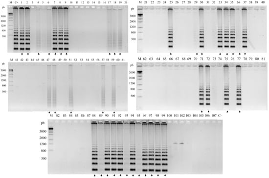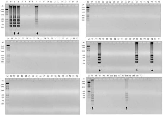 Positive environmental samples for FOM by RCA screening. Molecular marker 1 kb. C+, positive control F. monophora (CBS 269.37); C-, negative control F. erecta (CBS125760). Bacabeira: 1–5, decomposing plant material; 6–10, leaf; 11–15, thorns; 16–20, steam; 68–72, soil. São Benedito do Rio Preto: 21–25, decomposing plant material; 26–30, leaf; 31–32, thorn; 33–37, steam; 73–77, soil. Pinheiro: 58–62, decomposing plant material; 63–67, leaf; 48–52, steam; 78–82, soil. Nina Rodrigues: 53–57, decomposing plant material; 43–47, leaf; 38–42, steam; 83–87, soil; 88–107, shell of babassu coconut. Positive samples are indicated by arrows.
