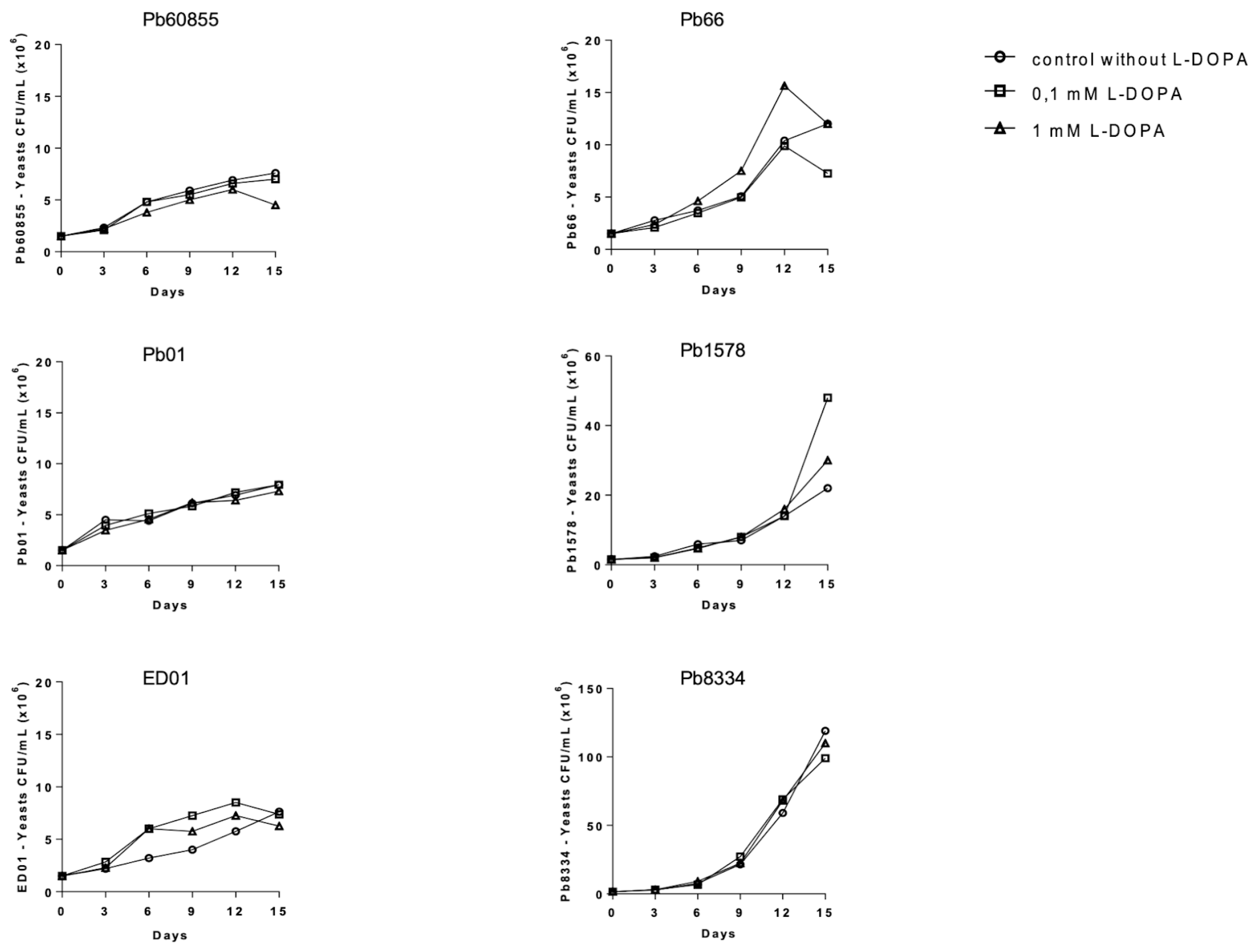 3.1. Influence of L-DOPA on the Growth and Melanization of Yeasts in Liquid Medium among Paracoccidioides spp.