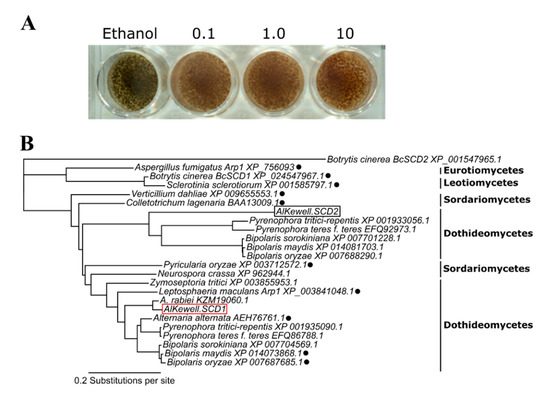 Phylogenetic analysis using the amino acid sequences of SCD orthologs from other DHN melanin-producing fungal species belonging to Eurotiomycetes, Dothideomycetes, Sordariomycetes and Leotiomycetes inferred two major clades (Clades 1 and 2). Analysis revealed that SCDs from B. cinerea and S. sclerotiorum, members of Leotiomycetes, cluster together and form a distinct clade, alongside with A. fumigatus ARP1, belonging to Eurotiomycetes. On the other hand, AlKewell AlSCD1 and AlSCD2 (Clade 2) belong to two different subclades where AlKewell AlSCD1 clusters with SCDs from Sordariomycetes and other Dothideomycetes that have been extensively studied. Specifically, AlSCD1 is closest to its sister taxa, A. rabiei and the previously studied fungal pathogen Alternaria alternata Brm1 [37] and Cochliobolus heterostrophus (anamorph Bipolaris maydis) Sal1 [8] (Figure 1B). As such, AlSCD1 was chosen for functional characterization.