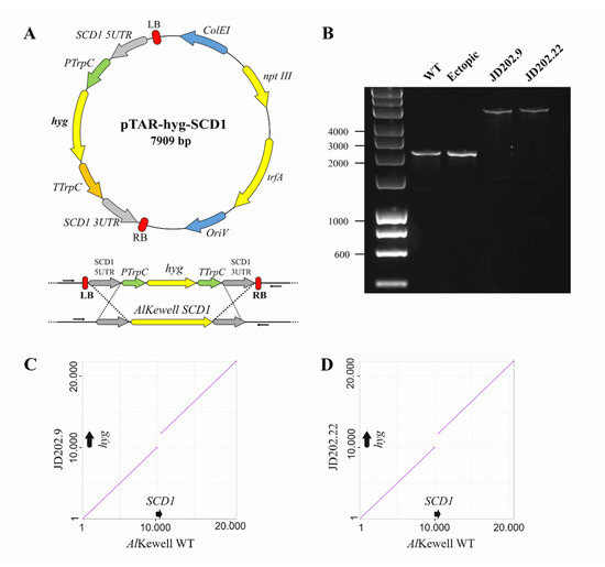 To verify the replacement of AlSCD1 with the hph cassette, the genomes of the AlKewell WT, two AlKewell scd1::hyg (JD202.9 & JD202.22) mutants and one AlKewell ectopic transformant were sequenced using the MinION Oxford Nanopore platform. A total of 13 Gbp of data was de novo assembled, resulting in a genome assembly of 42.97 Mbp, 43.21 Mbp, 43.21 Mbp and 42.90 Mbp for AlKewell WT, AlKewell sch::hyg (JD 202.9/202.22) and AlKewell ectopic, respectively, with an average read coverage of 21x, 31x, 23x and 23x. Using BLASTn with the hph cassette gene sequence as well as the full pTAR-hyg-SCD1 vector sequence against the de novo genome assemblies revealed the integration of the hph cassette in the genome of all three transformants. A closer inspection of the T-DNA reads in the genomes of scd1::hyg (JD202.9 & JD202.22) mutants showed the complete replacement of the AlSCD1 gene with a single copy of the hph cassette that includes PtrpC promoter, hygromycin B gene and TtrpC terminator (Figures S3 and S4). Furthermore, comparative genome analysis of AlKewell WT and AlKewell scd1::hyg JD202.9 and JD202.22 genomes confirmed single insertion and that hph cassette replaced the AlSCD1 ORF without altering its reading frame (Figure 2C,D, Figures S3 and S4). Insertion of the hph cassette is not found anywhere else in the genome of both AlKewell scd1::hyg transformants (JD202.9 & JD202.22). On the other hand, mapping of the hph cassette to the genome of the ectopic mutant showed that the insertion is off-target and that the hph cassette sits in a different contig. Integration of the full disruption vector sequence was not observed for all three mutants. The long reads provided by Nanopore sequencing technology offer the advantage of detecting deletion, replacement or any variation that spans over an entire region. As a result, this technology provides a more accurate view of the genetic variation including identification of copy number. Thus, long read sequencing proves to be an effective alternative method to characterize and assess transformants as compared to Southern Blot method.