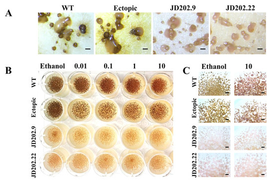 Colony morphology of AlKewell wild type (WT) and transformants grown on ½ PDA for seven days. (A) Representative photo from three replicate photos were taken using SMZ-800 stereomicroscope with a DS-Fi1C Digital camera (Nikon Instruments, Melville, NY, USA). Scale bars are 200 µm. (B) Inhibition of melanin production in AlKewell WT and transformants using tricyclazole. Representative photo from three replicates of isolates grown in ½ PDA supplemented with different concentrations of tricyclazole grown for seven days. Tricyclazole concentration is expressed as µg mL−1. (C) Magnification of isolates (from B) grown with (10 µg/mL) and without (ethanol) tricyclazole from three replicate photos taken using SMZ-800 stereomicroscope with a DS-Fi1C Digital camera (Nikon Instruments, Melville, NY, USA). Scale bars are 1mm.