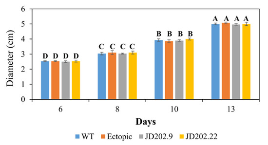 Fungal melanin has been associated with several developmental and pathogenic characteristics. To determine the effect of deleting the AlSCD1 gene in the developmental process of A. lentis, the radial colony growth of AlKewell WT and the transformants on ½ PDA plates were monitored in the course of 13 days. The diameter of the colony was measured every 2–3 days starting on day six. Colony growth increased steadily from approximately 2.5 cm for all three strains from day six and doubled in diameter after 13 days. No significant difference in diameter was observed between AlKewell scd1::hyg JD202.9, JD202.22 transformants and the ectopic transformant (Tukey HSD test, p = 0.7367 for isolates; p < 0.0001 for days) with the growth rate of the transformants comparable to the wild type (Figure 4). This clearly suggests that neither AlSCD1 nor melanin alter growth and development of AlKewell in vitro on ½ PDA plates. A similar observation was made in the albino mutants of Grosmannia clavigera with pks and scd gene disruptions [46], and A. rabiei Ar20 with a disrupted pksAC gene [16], which all had growth rates comparable to their respective WT. In contrast, alteration of melanin production in plant fungal pathogens, S. sclerotiorum [43] and A. rabiei AR628 [16], and the human pathogen Lomentospora prolificans [47] showed a significant reduction in the growth rate of the albino mutants.
