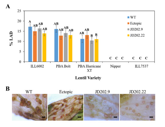 Pathogenicity of the wild type and transformant strains of AlKewell were assessed as previously described by Henares et al. (2019) [18]. Briefly, spores were prepared from one-week old ½ PDA plates, washed with water, filtered through sterile cotton wool and resuspended in water to a final concentration of 1 × 106 spores mL−1. Two-week old plants were spray-inoculated until run-off. Inoculated plants were kept in a chamber with a misting regime of five seconds every two hours for nine days. The temperature was maintained at 18 °C with a 12/12-h photoperiod. Disease symptoms were evaluated for each plant as leaf lesions of the four nodes that was spray inoculated at 14 days post infection (DPI) and scores were reported as % leaf area damage (LAD). Three independent experiments were carried out for each lentil genotype.