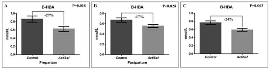 Graphical representation of (A) β-hydroxybutyric acid (B-HBA) in ewes’ blood prepartum (mean ± SE), (B) β-hydroxybutyric acid in blood postpartum (mean ± SE), and (C) β-hydroxybutyric acid in blood of ewes in Control (black, n = 51 ewes) and ActiSaf (grey, n = 53 ewes) groups in experimental period of 12 weeks (mean ± mean standard error (SEM)).