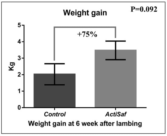 Graphical representation of body weight gain (recovery) between lambing and 6th week of lactation of ewes in Control (black, n = 51 ewes) and ActiSaf (grey, n = 53 ewes) groups (mean ± SE).