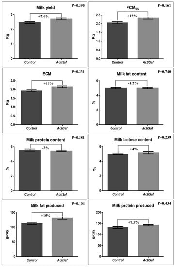 Milk, fat corrected milk 6% (FCM6%), and energy corrected milk yield (ECM) were numerically increased by 7.6 (2.50 vs. 2.69 kg/day, SEM = 0.159, p = 0.395), 12 (2.07 vs. 2.32 kg/day, SEM = 0.126, p = 0.161), and 10% (1.93 vs. 2.13 kg/day, SEM = 0.116, p = 0.231), respectively, in the ActiSaf compared to the Control group (Figure 3; Table S6; Figure S1). Concerning milk chemical composition, fat and protein contents were slightly decreased by 1.2 (p = 0.740) and 3% (p = 0.381), respectively, in the ActiSaf group, due to higher daily milk yield. However, both daily milk fat (114 vs. 131 g/day, SEM = 7.188, p = 0.104) and milk protein production (133 vs. 143 g/day, SEM = 8.288, p = 0.434) were increased by 15 and 7.5%, respectively, in the ActiSaf group (Figure 3; Supplementation Table S6). The milk yield in the treated ewes showed a moderate increase after the third week in lactation, and a peak in the fourth week, indicating a more intense milk persistence.