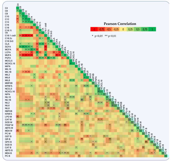 Heat-map represents a Pearson correlation of milk fatty acids, immune system gene expression in monocytes and neutrophils, antioxidant enzymes activities, total antioxidant capacity, and oxidative indices in both blood plasma and milk of ewes. In immune system genes, M = monocytes and N = neutrophils, while in antioxidants B = blood plasma and M = milk. CCL5: C-X-C motif chemokine 5, CXCL16: C-X-C motif chemokine ligand 16, INFG: Interferon γ, IL1B: Interleukin-1 beta, IL2: Interleukin-2, IL6: Interleukin-6, IL8: Interleukin-8, IL10: Interleukin-10, TNF: Tumor Necrosis Factor, NFKB: Nuclear Factor kappa B, GST: Glutathione transferase, GR: Glutathione reductase, SOD: Superoxide dismutase, GPx: Glutathione peroxidase, CAT: Catalase, ABTS: 2,2′-Azino-bis (3-ethylbenzthiazoline-6-sulfonic acid), FRAP: Ferric Reducing Ability of Plasma, MDA: Malondialdehyde, PCs: Protein carbonyls, LPO: Lactoperoxidase, VA: Vaccenic acid, CLA: Conjugated linoleic acid, SCFAs: Short-Chain saturated fatty acids, MCFAs: Medium-Chain saturated fatty acids, LCFAs: Long-Chain saturated fatty acids, MUFAs: Mono-unsaturated fatty acids, and PUFAs: Poly-unsaturated fatty acids.