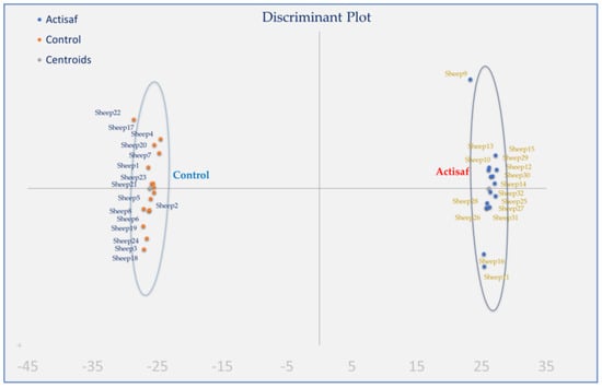 Moreover, discriminant analysis was also applied to pooled data to establish those variables capable of distinguishing and classifying samples among the two dietary treatments. Wilk’s lambda (λ) criterion was used for selecting discriminant variables []. Forty variables were entered to develop a model to discriminate the thirty-two samples of each case. Specifically, five variables were used for grouped fatty acids in milk, ten and 10 for immune system genes’ relative expression in monocytes and neutrophils, respectively, and seven and eight in antioxidant indices in milk and blood, respectively.