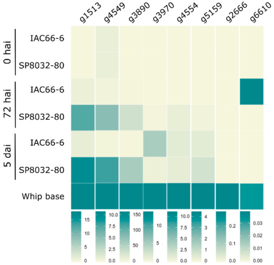 In our data, the host genotypes influenced the candidates’ expression profiles. For instance, the induction of g3890 after 72 hai only in resistant plants agreed with the increased hydrogen peroxide content (70%) in this same resistant genotype infected with S. scitamineum [25]. Although further experiments are necessary, the association of g3980 with ROS induction stands out as a valid hypothesis. We detected a similar expression pattern for g1513 and g4549. Other candidates (g1052, g1084, g4554, and g5159) were expressed in both resistant and susceptible plants.