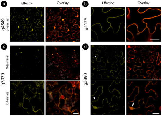 While some proteins showed stable localization regardless of tag location, some varied the targeting patterns (Table 3). For those CEs delivered to specific compartments, such as the cell wall (for g5159) and mitochondria (for g3890), colocalization assays with cellular markers were performed to confirm specificity (Figure 3). We also explored localization with other cellular markers for CEs with inconclusive subcellular localizations (g3970 and g6610) fused with an N-terminal tag. However, colocalization did not reveal a particular compartment, suggesting protein aggregations (Figure 2c, upper panel).