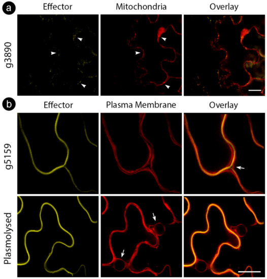 Cellular markers co-infiltrated with S. scitamineum candidate effector proteins. (a) g3890 co-infiltrated with mitochondrial marker, showing colocalization (white arrowheads) (b) g5159 co-infiltrated with plasma membrane marker before (upper row) and after (bottom row) plasmolysis with 0.5M NaCl. Note the localization of effector fusion protein between plasma membranes of adjacent cells (white arrow, upper row) and plasma membrane regression after plasmolysis (white arrows, bottom row). Bars: 20 µm.