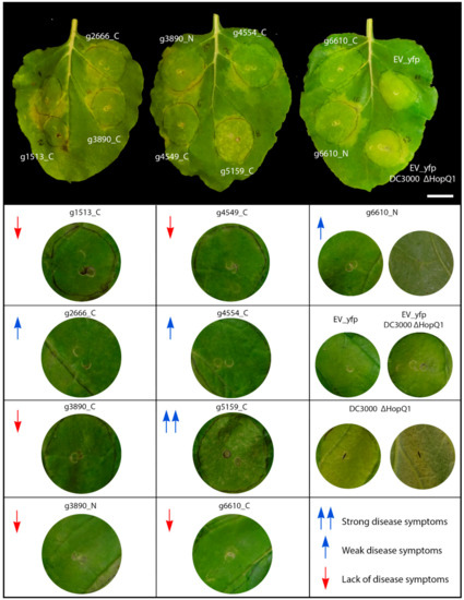 The set of CEs (g2, g1513, g3890, both N- and C-terminal versions; g4549 and the C-terminal tagged g6610) did not exhibit disease symptoms (Figure 4, red down arrows). Conversely, g5159 strongly increased Pst disease symptoms with the aggressive production of water-soaked lesions and chlorotic spots (Figure 4, double blue up arrow). The effectors g2666, g4554, and the N-termini tagged version of g6610 showed weaker disease symptoms (Figure 4, blue up arrows).