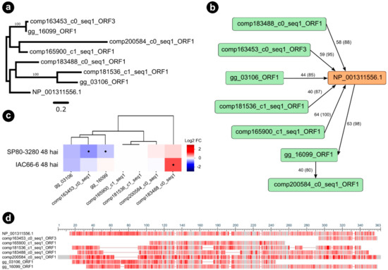 Sugarcane orthologs from orthogroup 5159_6 of Nicotiana tabacum (NP_001311556.1) endochitinase A precursor identified as interacting with g5159. (a) Maximum likelihood phylogenetic tree of endochitinase A gene family in sugarcane and Nicotiana tabacum. Nodal support values are given as posterior probabilities (%) above the branches if > 85%. (b) Graph showing the predicted orthogroup, with nodes depicted as green and orange rectangles representing sequences, and edges depicted as black arrows connecting nodes if they established a query-subject BLASTp relationship. Queries are at the source of arrows, whereas subjects are at the target of arrows. Edges labels represent BLASTp percentage of identity and query coverage. (c) Heatmaps showing expression profiles of sugarcane genes from orthogroup as values of a log2 fold change (inoculated/control) across two transcriptome experiments. Blue colors indicate downregulation, whereas red colors indicate upregulation. Diamonds represent statistical significance of expression at p < 0.05. (d) Multiple sequence alignment overview of the orthogroup obtained with the NCBI “Column Quality score—Protein” method showing conserved regions in grey bars, and alignment gaps as grey lines. Infrequent bases are highlighted as a red color gradient where darker red means more frequent and lighter red less frequent amino acids.