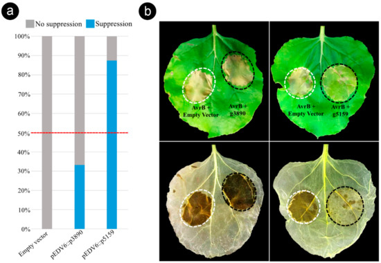 Bacterial suspensions of Pf EtHAn expressing pVSP6::AvrB [45] and Pf EtHAn expressing the effector candidates individually (g3890 and g5159) were mixed (1:1 ratio) to a final of 2 × 107 CFU mL−1 and co-infiltrated into four- to five-week-old N. benthamiana leaves using a needleless syringe. Co-infiltrations of Pf EtHAn (pVSP6::AvrB) and Pf EtHAn (pEDV6 empty) were used as negative controls in the same conditions. The level of suppression was estimated by an average percentage calculated on all infiltrated leaves in three independent experiments with eight biological replicates.