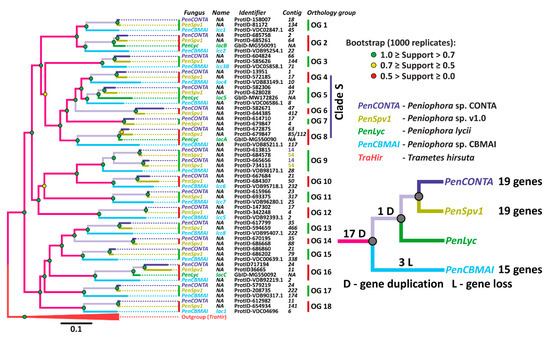 The topology of the phylogenetic tree indicates that the process of duplication of the ancestral laccase gene began before the splitting of the evolutionary branch leading to fungi of the Peniophora genus into different species. Moreover, after the division into species, both gene duplications and losses were rare events. The loss of laccase genes is observed only in the evolutionary line leading to Peniophora sp. CBMAI (clades 6, 7, and 14), and duplication occurs only in the closest common ancestor for Peniophora sp. CONTA and Peniophora sp. v1.0 (clade 9). It should be noted that a similar picture of the evolution of laccase genes—early multiple duplication with subsequent retention of an almost unchanged number of genes—was also described for fungi from the Core and Residual Polyporoid clades of the Polyporales order [13,55,56,57]. Similar to the Polyporales order, since almost all detected gene duplications occurred in the common ancestor of all Peniophora spp., all 18 clades on the constructed tree can be regarded as well-defined orthology groups.
