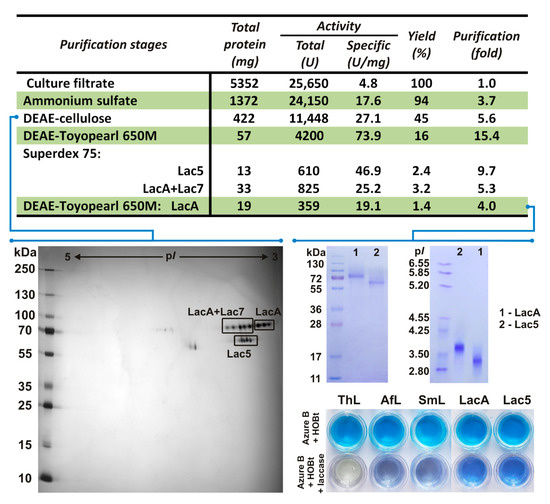 Purification scheme of P. lycii laccases and redox potential evaluation for purified Lac5 and LacA using the Azure B decolorization test. ThL—Trametes hirsuta laccase A (E0 T1 = 780 mV), AfL—Antrodiella faginea laccase A (E0 T1 = 620 mV), SmL—Steccherinum murashkinskyi laccase 2 (E0 T1 = 650 mV).