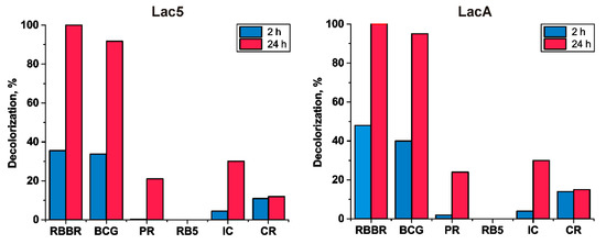 As it is shown in Figure 3, both Lac5 and LacA demonstrated near identical dye-removing capacity. Within 24 hours’ time, these isozymes almost entirely decolorized such dyes as BCG and RBBR. The dyes IC, PR, and CR were decolorized only by approximately 35, 15, and 10%. In the case of RB5, there was no decolorization detected.