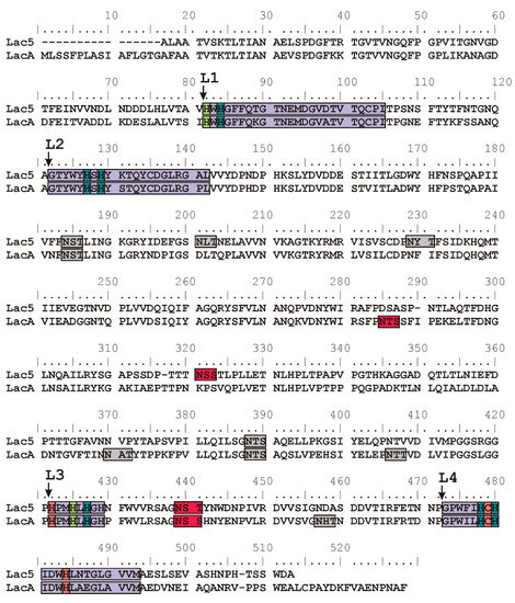 Alignment of the amino acid sequences of Lac5 and LacA from P. lycii. Laccase signature regions L1–L4 (according to [69]) are indicated with violet. Copper coordinating amino acid residues are indicated with coral for the T1 copper ion, leaf green for the T2 copper ion, and marine blue for the pair of T3 copper ions. Potential glycosylation sites are colored with gray and occupied glycosylation sites are colored with red.