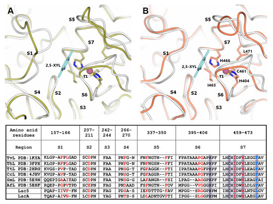 The oxidation of the substrate takes place at the T1 copper center of laccase [63]. Laccase catalytic activity significantly depends on the T1 copper center redox potential and also on the structure of the loops near the T1 copper center which form the substrate binding pocket [34,64,65]. To reveal the structural features of the potential substrate binding pocket of P. lycii laccases, homology-based modeling was performed. For both Lac5 and LacA, the high-resolution structure of S. murashkinskyi laccase (PDB 5E9N) was used as a template. GMQE scores were 0.83 for the Lac5 model and 0.82 for the LacA model which indicate a generally high quality of the predicted structures. It should be noted that the substrate binding pocket of laccase is formed by conservative regions (S2, S3, and S7 in Figure 5) and also by variable flexible loops (S1, S4–S6 in Figure 5) near the T1 copper center. Therefore, the obtained models could be used only for the mapping of amino acid residues potentially forming the substrate binding pocket of P. lycii laccases on the 3D structure of the enzyme, but the actual positions of the variable loops may differ.
