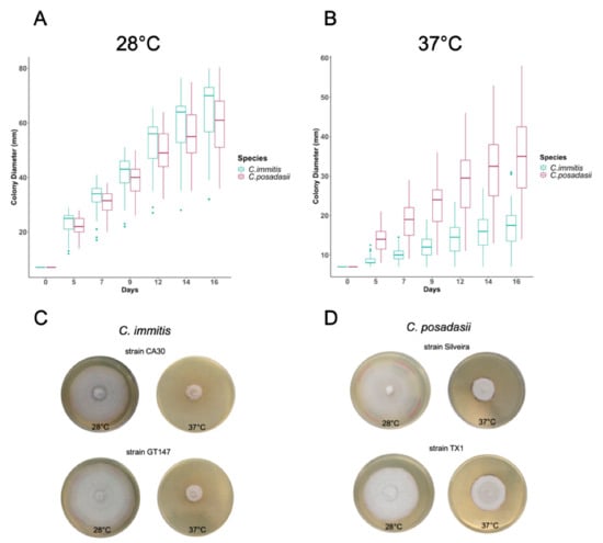 Thermotolerance is an intrinsic characteristic of an organism that allows for tolerance of excessively high temperatures. Heat acclimation can shape natural populations for a wide range of microorganisms, and is a physiological adaptation to heat stress imposed by the colonization of new habitats, global climate change and encountering new hosts [,,,,,,,,]. This “preadaptation” is particularly important to pathogenic fungi that can grow in high temperatures, which allows colonization of mammalian tissues [,]. For example, Coccidioides is adapted to grow at high temperatures in the environment (i.e., North and South American deserts), and is able to colonize a wide range of endothermic hosts throughout the Americas [,,,,]. C. immitis is endemic to the California Central Valley; whereas C. posadasii is widely distributed, but has highest prevalence in the Sonoran Desert. The annual mean temperature varies between the endemic areas, with the California Central Valley having more mild temperatures compared to the Sonoran Desert, which led us to hypothesize that C. posadasii is more thermotolerant than C. immitis. Therefore, we investigated the growth rate of both species at 37 °C and 28 °C, so that we might elucidate species-specific phenotypic variation. Here we demonstrate thermotolerance dissimilarity of the two species by analyzing growth rates of 85 isolates at these two temperatures.