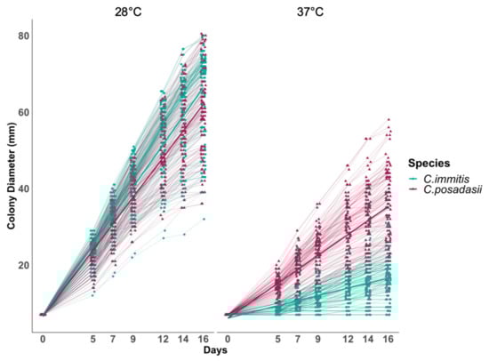 Radial growth rate of 85 isolates of Coccidioides demonstrates species-specific response to temperature. Each line represents the mean diameter (y-axis) for each isolate in triplicate (46 C. immitis and 39 C. posadasii) at a given time point (x-axis). Dark lines represent mean growth rate of each species. Radial growth was measured at day 5, 7, 9, 12, 14 and 16. There is a significant difference in growth rate (slope) in response to higher temperature between species of Coccidioides. The radial growth rate of C. immitis is decreased at a higher temperature 37 °C (slope37 = 0.64 mm/day; 95% C.I. 0.51–0.78) compared to C. posadasii (slope37 = 1.82 mm/day; 95% C.I. 1.49–2.16). Both species appear to tolerate 28 °C and grow at a similar rate (C. immitis slope28 = 3.73 mm/day; 95% C.I. 3.53–3.92, C. posadasii, slope28 = 3.47 mm/day; 95% C.I. 2.98–3.90).