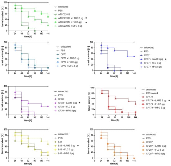 FLC concentrations were chosen based on previous work, in which 5 μg FLC were shown to be efficient against C. orthopsilosis [], a close relative of C. parapsilosis; this concentration resembles the maximum dose for humans recommended by EUCAST rational version 3.0. As the recommended maximum human dose did not show treatment effect for LAMB and MFG (Figure S1B,C), the concentration was raised to 5 x of the most commonly used dosage recommended by EUCAST. None of the antifungal used showed toxic effects on larval survival at the concentrations used. Larvae were incubated at 37 °C and survival was monitored every 24 h over a period of 6 days (144 h). Untouched larvae and larvae injected with sterile phosphate buffered saline (PBS) served as controls; fungal cells and antifungals were diluted in sterile PBS. For each test group, 20 larvae were used (seven strains and three antifungals, namely FLC, MFG, and LAMB); experiments were repeated at least three times. Significance was determined with log-rank (Mantel–Cox) test, utilizing GraphPad Prism 7.00 software. Differences were considered significant at p-values ≤ 0.05.