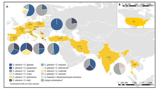 Rates, numbers, and species combinations found per country. (A) MY cases in Europe and Asia. (B) MY cases in the United States. The percentages shown inside each country represented the rate of MY per positive yeast cultures in each country and pie charts represent the MY combinations for each country.