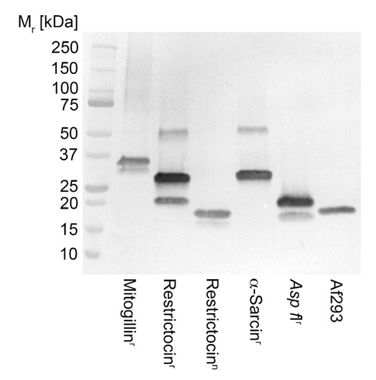 - Kao, R.; Martínez-Ruiz, A.; Martínez del Pozo, A.; Crameri, R.; Davies, J. Mitogillin and related fungal ribotoxins. Methods Enzymol. 2001, 341, 324–335. [Google Scholar]