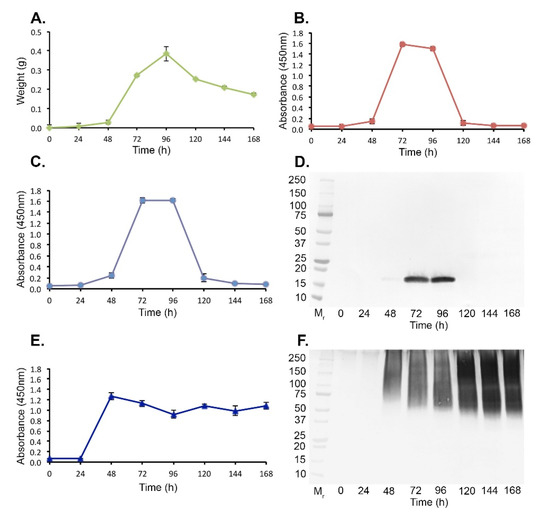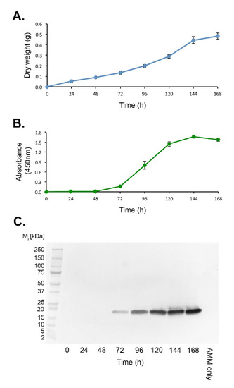 Hyphal growth of the sporulation-deficient mutant ΔAfbrlA in AMM shake culture increased steadily over time and started to plateau at 168 h post-inoculation (Figure 3A). Ribotoxin production, determined by Afu-ELISA® using mAb PD7 (Figure 3B), was first detected 72 h post-inoculation, with production increasing steadily thereafter until 144 h. Production then decreased concomitant with the plateauing in biomass accumulation. Western blot analysis (Figure 3C) using representative samples at each time point, revealed a similar trend to the Afu-ELISA® test, with production of a single 18 kDa ribotoxin first discernible at 72 h post-inoculation, and with detection at all time points thereafter.