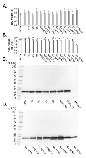 In order to determine whether mAb PD7 was reactive with ribotoxins produced by A. fumigatus strains other than isolate Af293, we tested an additional 14 independent isolates of the pathogen recovered from naturally-infested soil samples (Figure 4). We had first established, using ELISA and Western blotting tests of AMM protein precipitates of Af293 (Figure 2), that peak ribotoxin production occurred between 72 h and 96 h post-inoculation. We therefore grew the 14 different isolates (and Af293 as the positive control) in AMM for 72 h, and tested their protein precipitates in the Afu-ELISA® and in Western blots using mAb PD7. There were no significant differences in the dry weights of all 15 isolates after 72 h growth in AMM (Figure 4A) and, while detection of the antigen in the ELISA (Figure 4B) was significantly less in a single strain (SX750763) compared to Af293, the absorbance value for this strain was greater than the threshold value for test positivity (≥0.100). Western blots (Figure 4C,D) showed recognition by mAb PD7 of a single immuno-reactive 18 kDa antigen in all 15 isolates, while in the negative control (AMM only) the band was absent (Figure 4C).