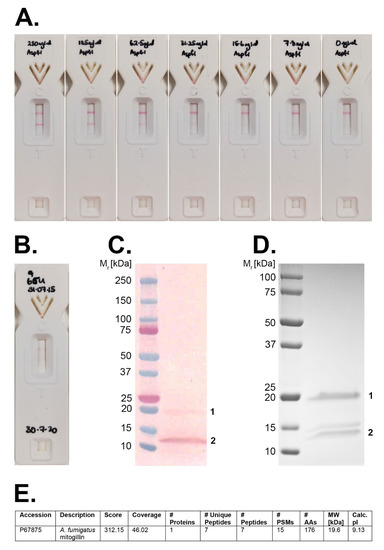 The limit of detection (LOD) of the Afu-LFD® test using FVU samples from healthy donors spiked with the 18 kDa ribotoxin Asp f I was ~15 ng protein/mL urine (Figure 5A). Faint test lines were visible using samples containing 15.6 ng protein/mL and 7.8 ng protein/mL, but no test line was visible in negative control urine (un-spiked FVU). Urine from a patient with acute myeloid leukaemia diagnosed with probable IPA according to EORTC guidelines (with microbiological criteria consisting of a serum GM ODI of 3.36 and serum β-D-glucan of 52 pg/mL, followed by a serum GM ODI of 1.84 four days later), yielded a weak but positive Afu-LFD® test result (Figure 5B). Examination of this sample by Western blotting revealed two PD7-reactive bands with molecular weights of ~19 kDa and ~12.5 kDa (labelled 1 and 2, respectively, in Figure 5C). The corresponding proteins resolved in a replica SDS-PAGE gel stained with Coomassie Blue (Figure 5D) were subjected to LC/MS, which identified the ~19 kDa protein as A. fumigatus mitogillin (Figure 5E). The identity of the 12.5 kDa PD7-reactive protein could not be established using this approach.