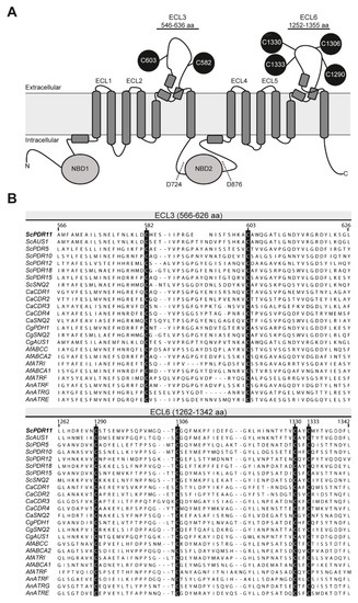 Similar to other members of the PDR subfamily, Pdr11p has two major ABC transporter domains, arranged in NBD1-TMD1-NBD2-TMD2 orientation (Figure 1A). Each TMD consists of 6 TM helices. The NBDs of Pdr11p contain all characteristic sequence motifs of ABC transporters. These include Walker A and Walker B motifs (which are involved in ATP binding and hydrolysis) and the C signature sequence, a hallmark of the ABC family. The transporter has two large extracellular loops, ECL3 (91 amino acid residues) and ECL6 (104 amino acid residues), that connect the last two helices of each TMD. ECL3 and ECL6 contain two and four cysteine residues, respectively (Figure 1A). Amino acid sequence alignment highlights that these cysteine residues are highly conserved among a number of members of the fungal PDR subfamily of transporters, including Pdr11p (Figure 1B). Alanine scanning-mutagenesis of 23 cysteine residues in the multidrug ABC transporter Cdr1p from Candida albicans has previously shown that five cysteine residues in the intracellular loops and TMD2 of this transporter play a role in protein functionality and localization. On the other hand, the alanine-to-cysteine substitution of another six cysteine residues in the extracellular loops of Cdr1p did not affect proper trafficking and drug transport [5]. Intriguingly, in the half-size mammalian drug transporter ABCG2, a prerequisite for dimerization of a functional protein unit is the formation of an intermolecular disulfide bond between C603 in the two large extracellular loops of the homodimers. Additionally, each large extracellular loop is stabilized by the formation of an intramolecular disulfide bond between C592 and C608 [6,7].