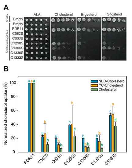 Notably, three cysteine mutants (C1290S, C1306S, and C1333S) still retained a reduced ability to transport certain sterols. Yeast strains impaired in sterol uptake but expressing Pdr11p mutants C1290S and C1333S were able to grow on media supplemented with cholesterol and to accumulate fluorescent and native cholesterol, although to a much lesser extent than cells expressing wild-type Pdr11p. Surprisingly, cells expressing Pdr11p mutant C1306 grew on plates supplemented with the plant sterol sitosterol but not on other sterols. It would be therefore interesting to test further its ability to accumulate this sterol variant. Thus, mutations within the large extracellular loop may change the substrate affinity of Pdr11p. Similarly, mutations in the disulfide-bond-forming cysteine residues of ABCG2, C592, and C608, altered the substrate specificity of the transporter [6].